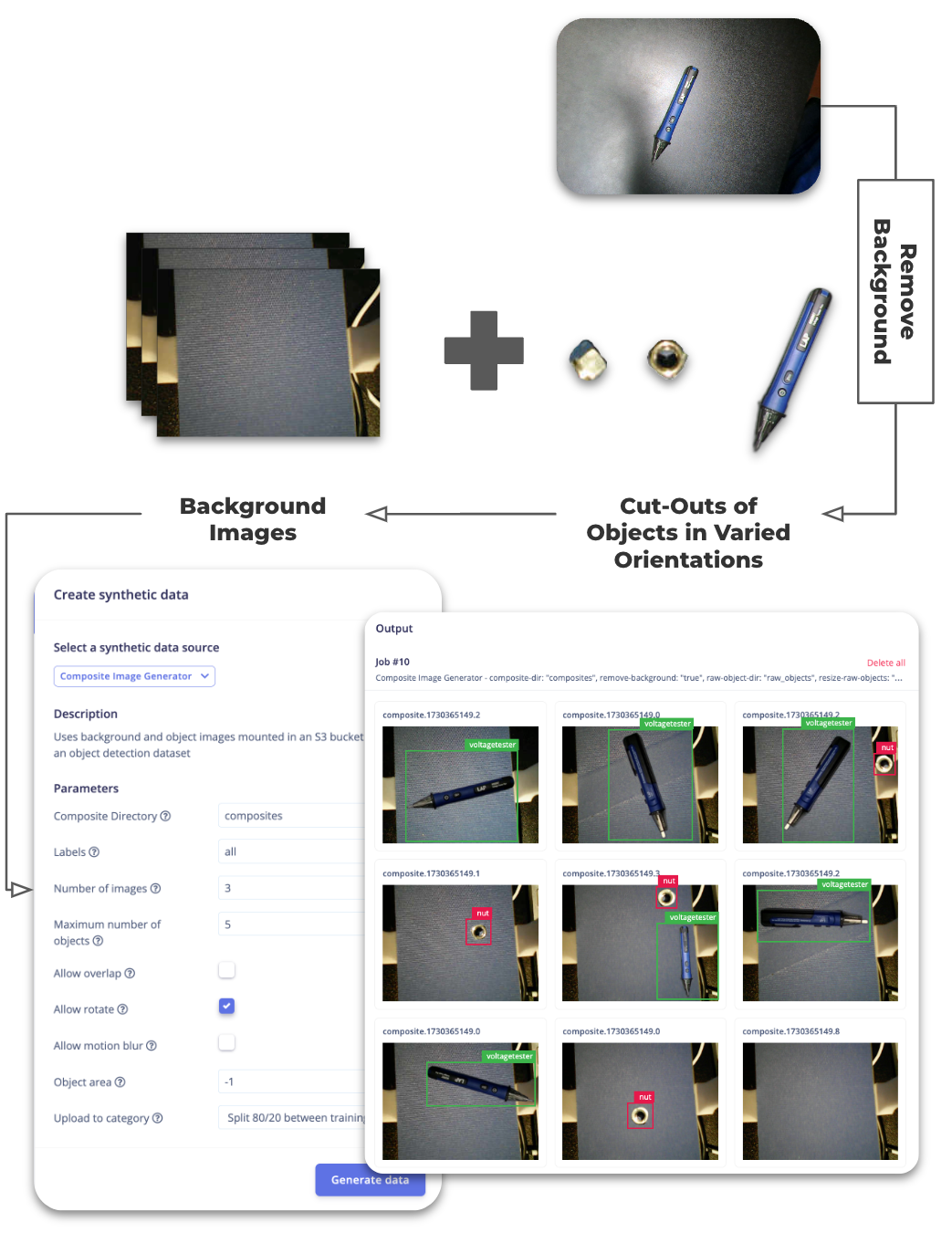 Data acquisition > Synthetic data, and select the Composite Image Generator. - Configure Your Parameters: Adjust settings like the number of images, object placement area, and other parameters.