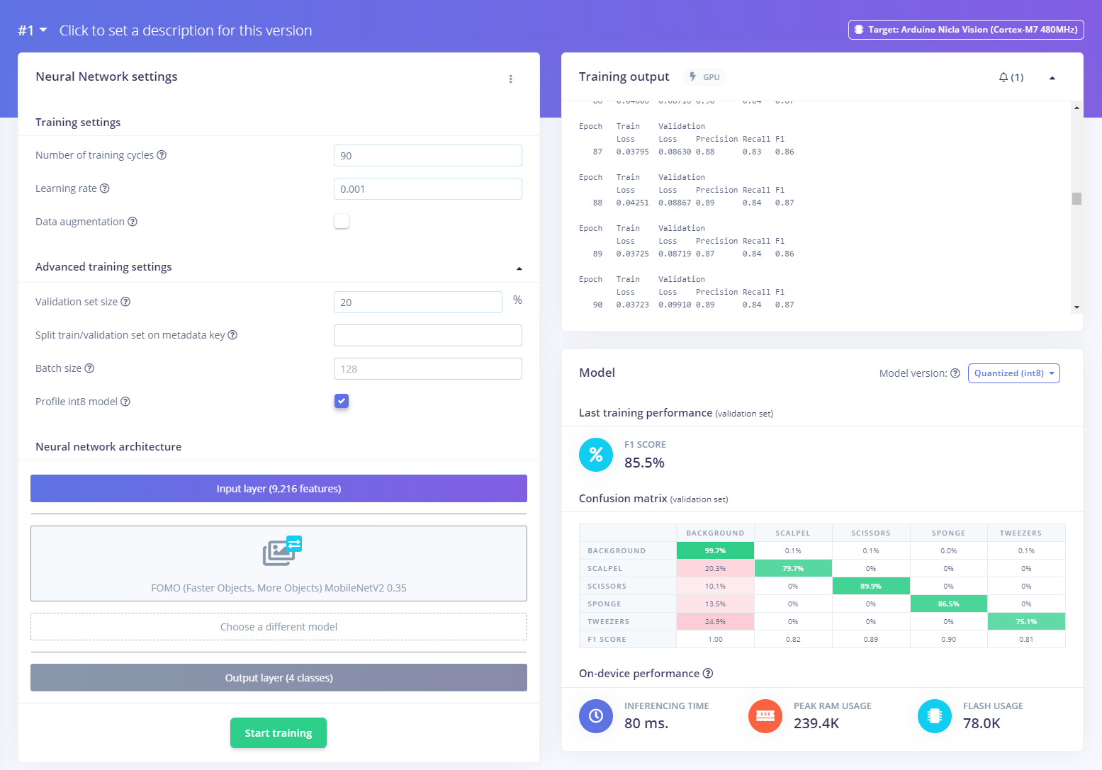 Holt was able to work through these problems by carefully selecting a set of tools that can address each of the challenges. On the hardware front, an Arduino Nicla Vision was chosen. At just 22.86 mm x 22.86 mm, it can easily clip on a shirt without getting in the way. With its built-in image sensor and an Arm Cortex M7 processor with 1 MB of RAM, it has the power to run some fairly sophisticated algorithms. Object detection algorithms, however, can easily stretch well beyond the capabilities of this device, so Holt utilized Edge Impulse’s FOMO object detection algorithm to not only make the development and deployment process simple, but also to optimize the model for the Nicla Vision hardware.