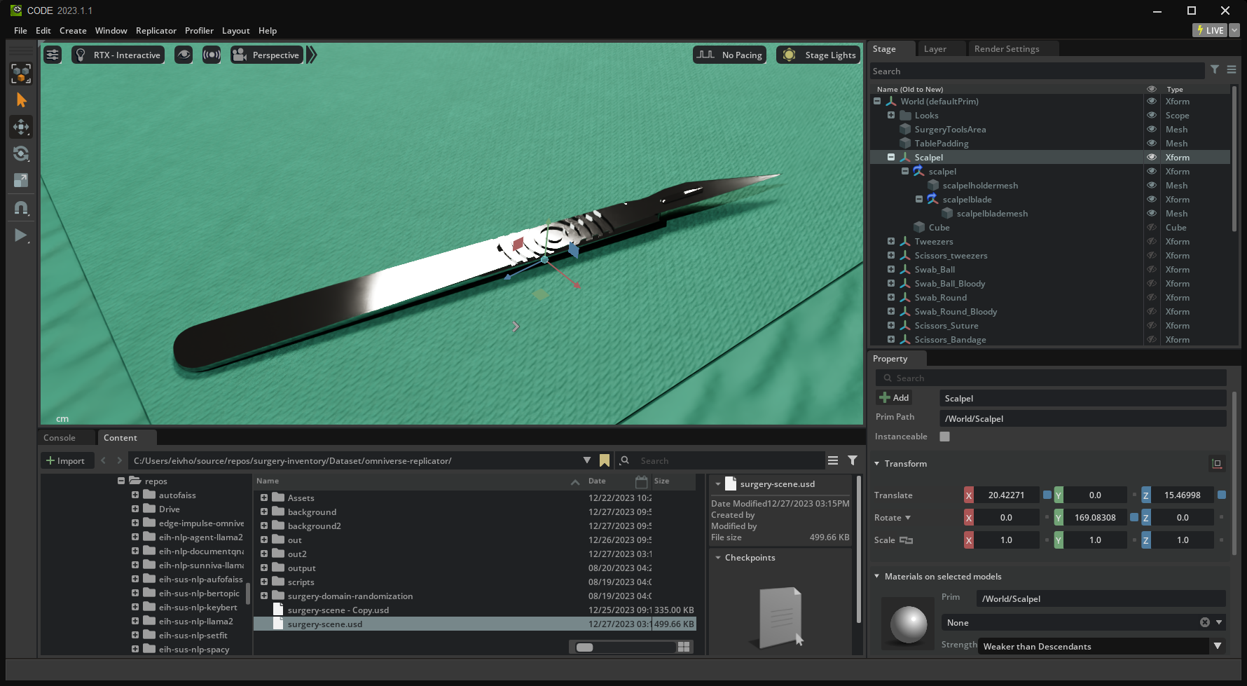 Collecting a larger, more diverse dataset would likely resolve this issue, but that can be very challenging, especially in the context of surgical equipment. So, Holt came up with the idea of utilizing NVIDIA’s Omniverse Replicator to quickly generate a large, varied dataset to further train the model. With this tool, 3D models of a wide variety of surgical instruments could be imported into a scene, then Replicator will move them around, adjust angles, lighting, and other factors to produce synthetic images that can be leveraged in model training. In this way, over 30,000 training images were produced.
