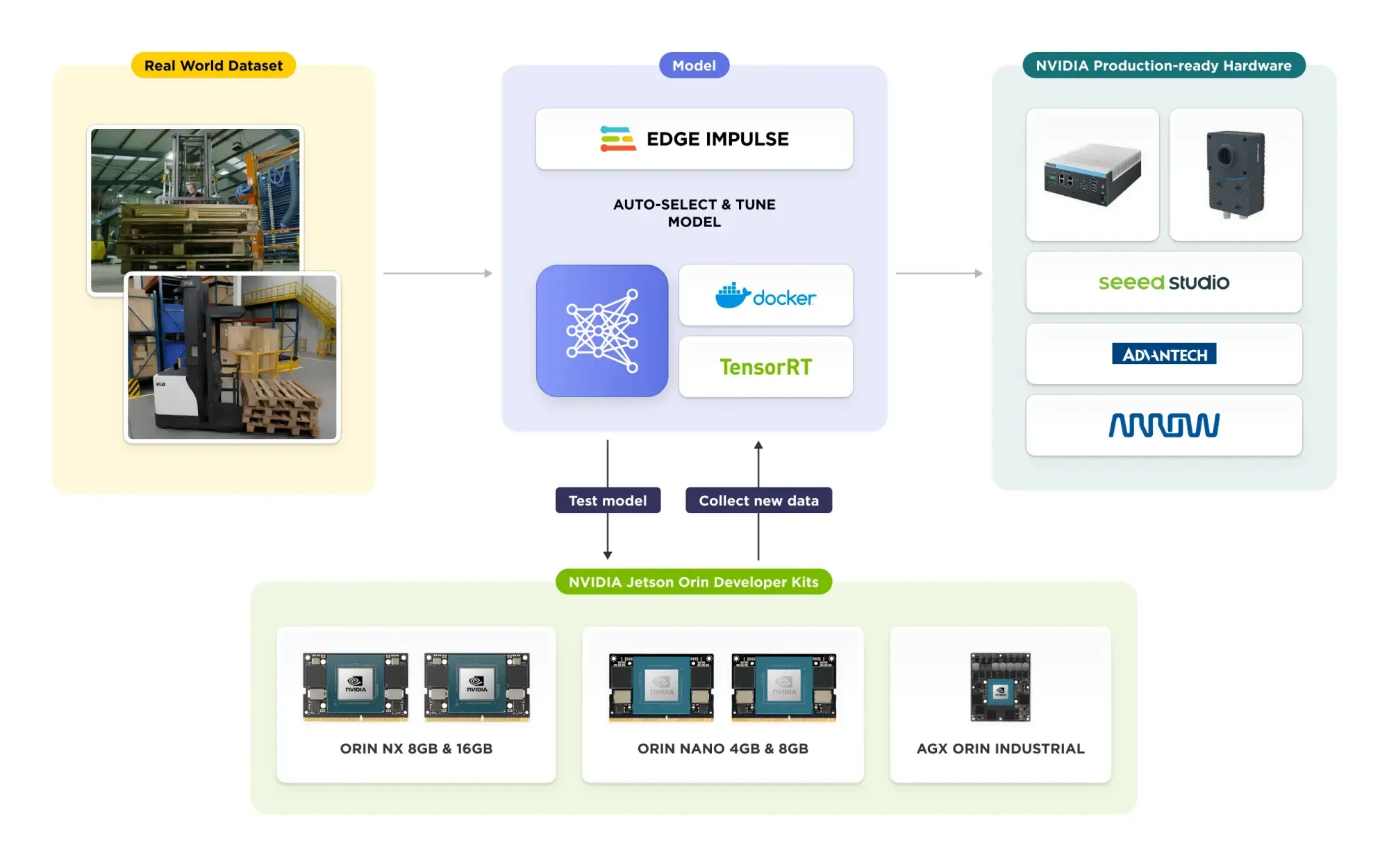Edge Impulse is pleased to announce that we have unlocked previously inaccessible NVIDIA AI capabilities for any edge device with NVIDIA Omniverse, alongside our launch of native support for NVIDIA Jetson Orin hardware. These developments further amplify what’s achievable at the edge for developers and enterprises who want to accelerate time to market and gain a competitive advantage with world-class AI solutions.