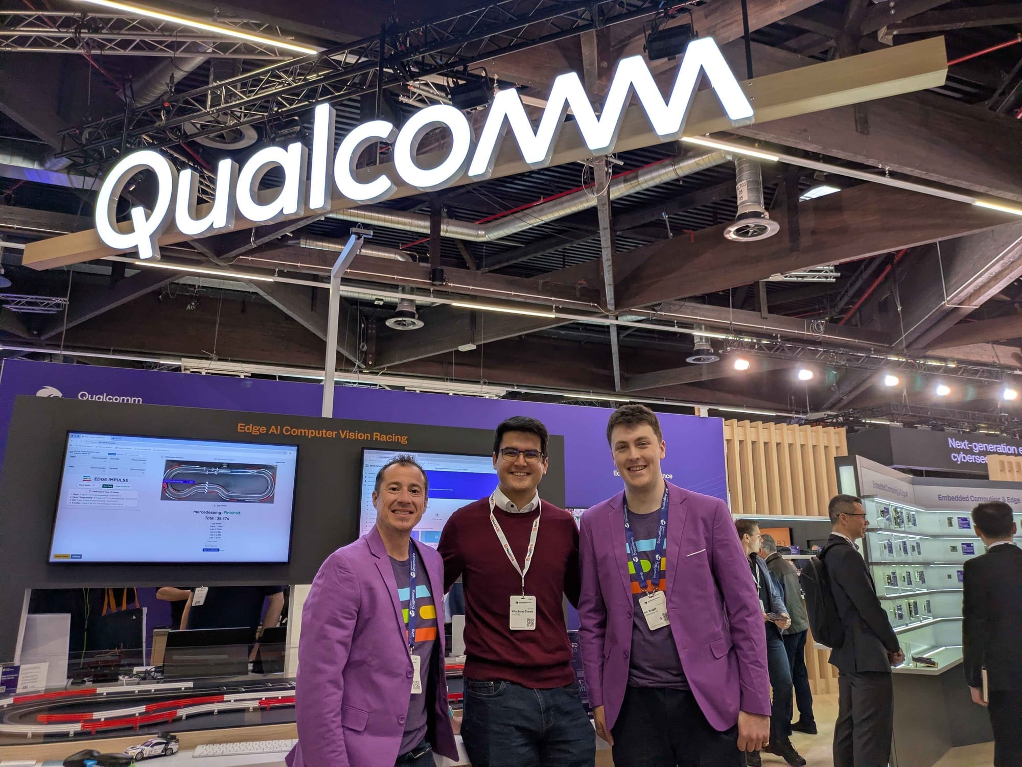 Alongside the VENTUNO Q, the new Arduino UNO Q board, with a similar architecture, was also making waves. Over at the Qualcomm booth, I got to see the UNO Q being used for high-speed tracking of slot cars racing around the track using Edge Impulse’s FOMO (Faster Objects, More Objects) algorithm.