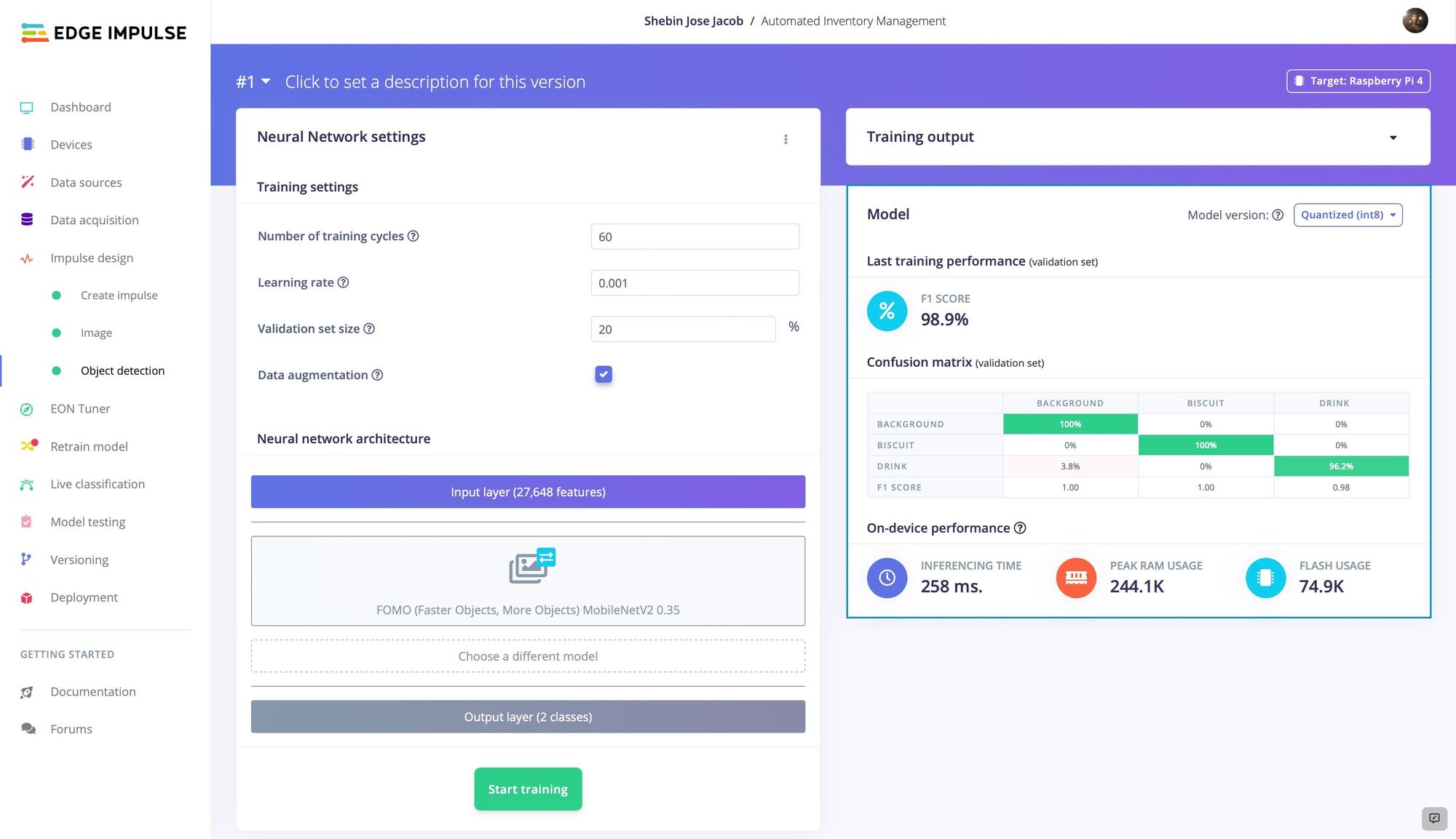 With a training dataset waiting in the wings, Jacob started designing the impulse that would analyze it. A preprocessing step was added to shrink the images to 96 x 96 pixels — this has the effect of reducing the amount of computational resources that are required later on. Next, a step was added to extract the most relevant features from the image data and forward them on to the machine learning model. Edge Impulse’s ground-breaking FOMO object detection algorithm was selected because it is both very accurate and highly optimized for running on edge computing platforms with minimal computational resources available. The algorithm was designed to detect drinks or biscuits, but that list could be made much larger and more specific by simply supplying a larger, more diverse set of training data.