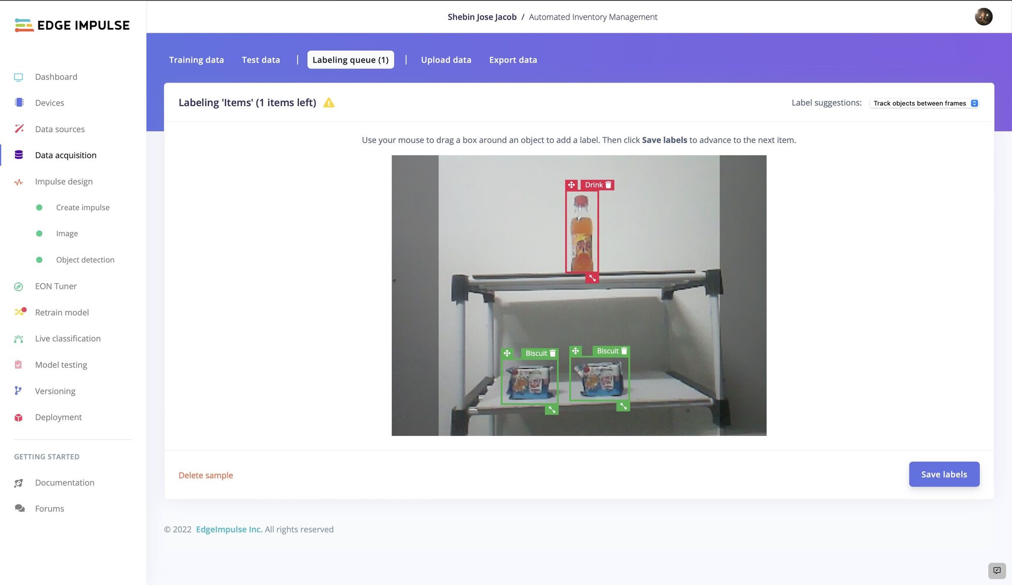 To prove the concept, two classes were initially chosen for demonstration purposes — “drink” and “biscuit.” The labeling queue tool was used to draw boxes around each item so that the model would have the information that it needed to learn what they look like. Since the labeling queue is an AI-assisted tool, it will do most of the work on its own. After the first few boxes are drawn, they will be automatically drawn for subsequent samples. All that is needed is to verify that the prediction is accurate, or make a small tweak to the box if a little adjustment is in order.