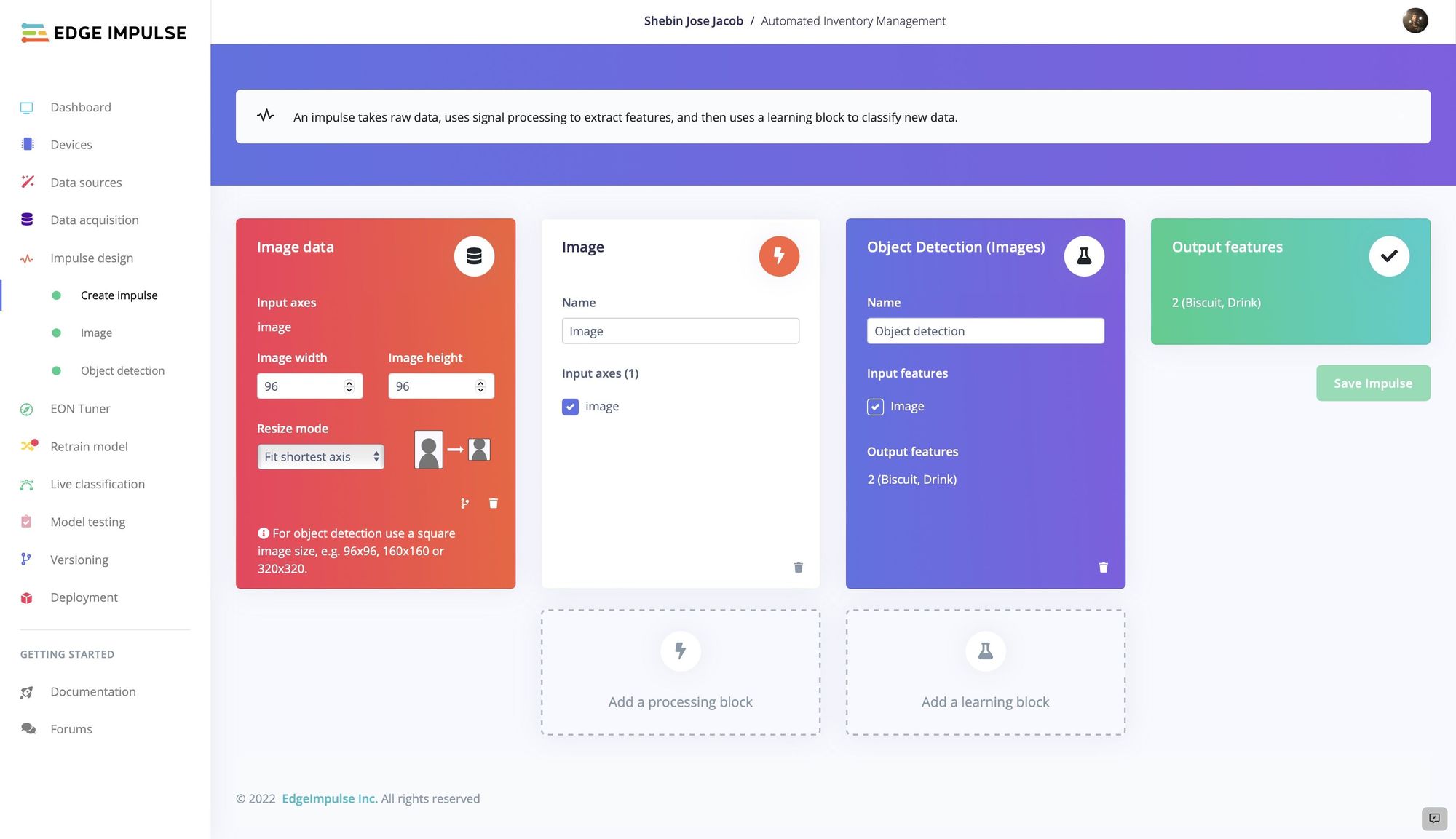 Rather than a manual process, Jacob has developed an automated solution that leverages computer vision and a machine learning algorithm developed with Edge Impulse Studio that continuously watches the products on a shelf, and immediately updates an inventory database as items are added or taken away. Having real-time information allows this proof of concept system to send an alert as soon as an item falls below a certain level of availability so that more can be ordered. As data is collected over time, the device will also give management insights into consumers’ shopping trends. Altogether, this system provides the information needed to help avoid inventory mismanagement disasters like those that many retailers are now dealing with.