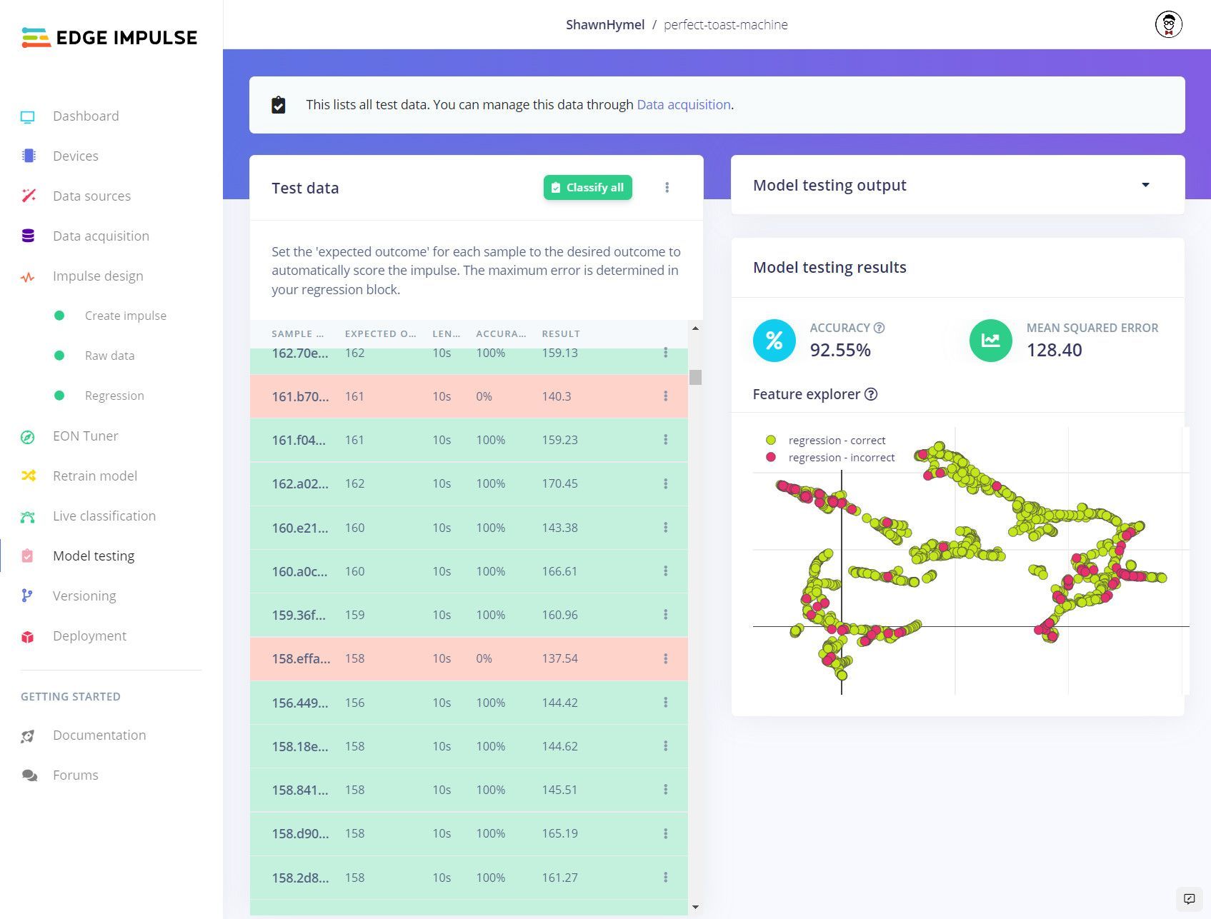 Hymel created an impulse with a preprocessing step that extracts the most informative features from the input data. Beginning in this way reduces the computational resources required by the model, and can also help to improve accuracy. Next, a regression model was added to the impulse to give precise information about how much longer the bread should be toasted. Specifically, the model predicts the number of seconds left until the toast burns.