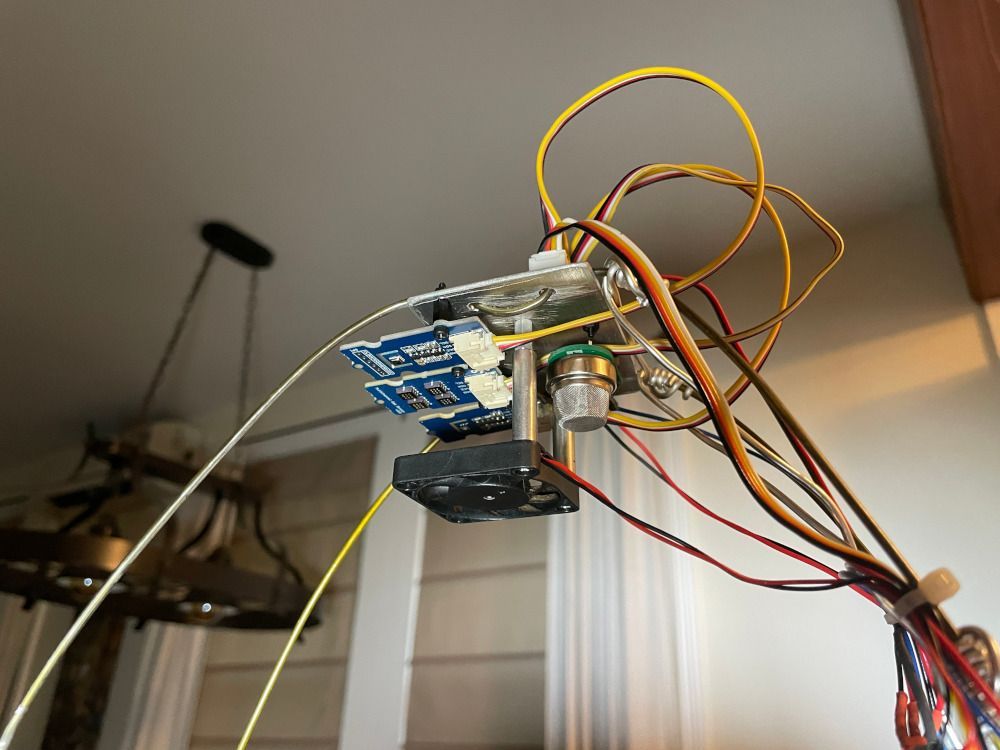 As a first step, Hymel needed to hack a toaster to get access to the control signals that start and stop the toasting process so that it could be controlled automatically by his device. He then created a wire structure that was used to position the sensors above the toaster. A small fan was also installed here to make sure a large quantity of the gasses exiting the toaster were passed over the gas sensors. A powerful Seeed Studio Wio Terminal was positioned to the side of the toaster, where it would be safe from getting itself toasted. The Wio Terminal provided the processing power with its Arm Cortex-M4F processor, and also gave some insight into what the Perfect Toast Machine was doing with its built-in display.