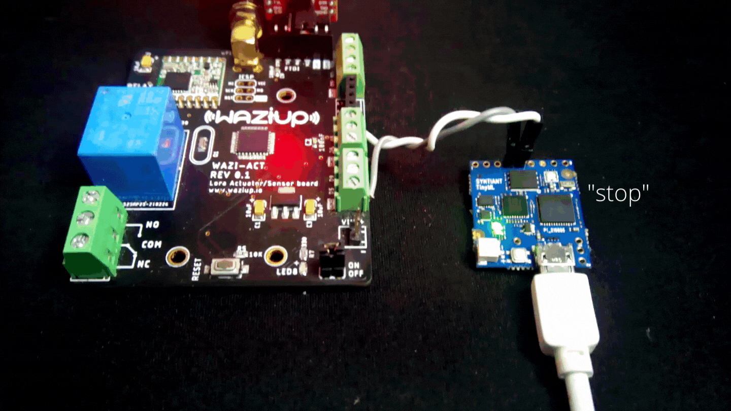 Before deployment in the real world, that firmware would need to be changed just a bit. Rather than flashing an LED, the GPIO pins on the Syntiant TinyML Board could be used to trigger just about any external action that is needed, like shutting down machinery. Githu demonstrated this with a WaziAct development board that has a relay used to actuate pumps, solenoids, or other electrical devices. He programmed it to shut down its main running task when it receives a signal from the Syntiant board indicating that a target word has been detected. With this example, it is easy to imagine how the device could be used in a production environment.