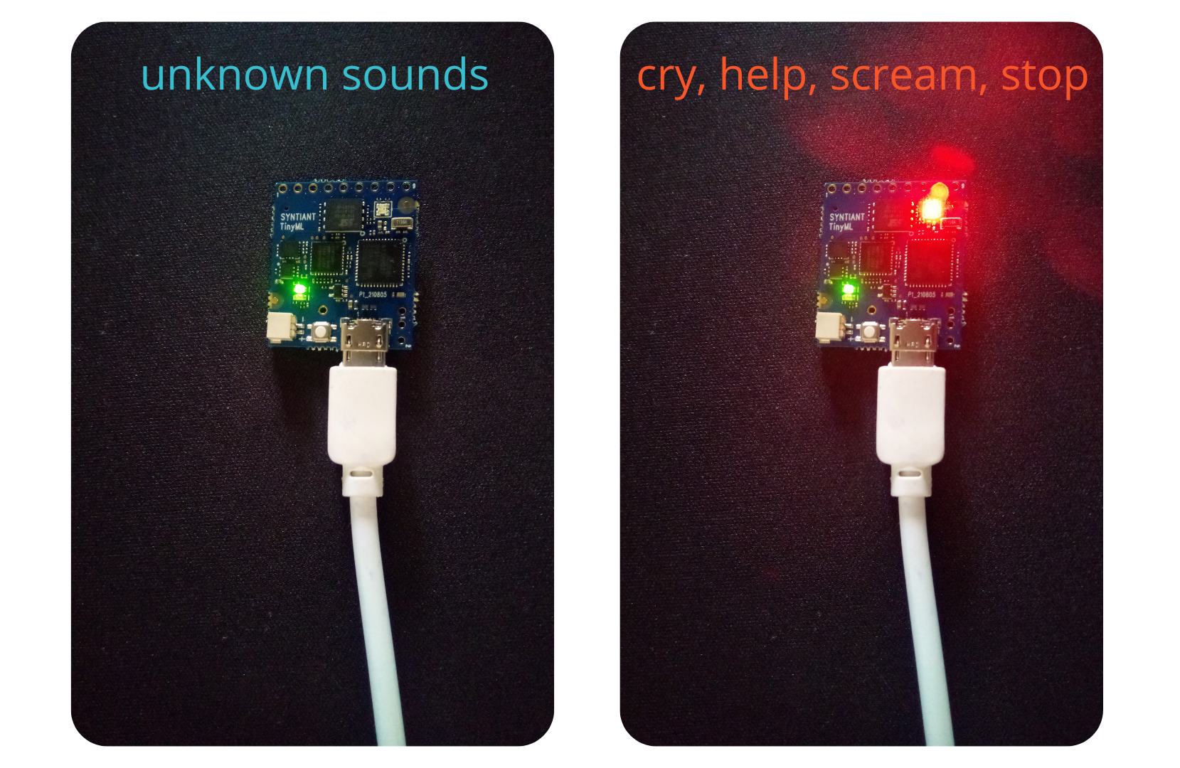 The Syntiant TinyML Board is fully supported by Edge Impulse, so deploying the model to the hardware was a snap. After clicking on the “Deployment” menu item, there is a “Syntiant TinyML” option under “Build firmware” that will package up a custom firmware image for download. The package contains a script that can be used to flash the image to the board via USB. After that has been done, the device’s onboard LED will flash red if any of the target sounds (cry, help, scream, stop) are detected. The light will remain green for all other detected sounds.