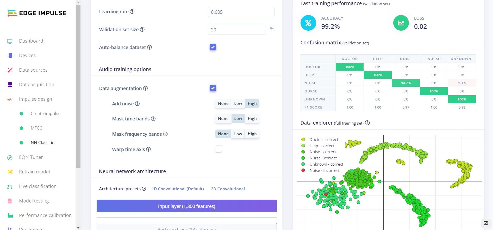 Now for the easy part — an impulse was created in Edge Impulse Studio consisting of an MFCC preprocessing block that is optimized for extracting the most relevant features from audio samples. This serves to reduce the computational overhead of subsequent steps and enable them to run on smaller hardware platforms, like microcontrollers. The features were fed into a neural network classifier, which will do the work of recognizing which of the known classes a new audio sample belongs to. The training process was initiated with the click of a button, and afterwards metrics were presented to give Milton-Barker an idea of how well the model was performing. With the average training classification accuracy coming in at 99.2%, the model was looking excellent. This result was validated using the live classification tool, which allowed for direct, on-device testing in real-time.