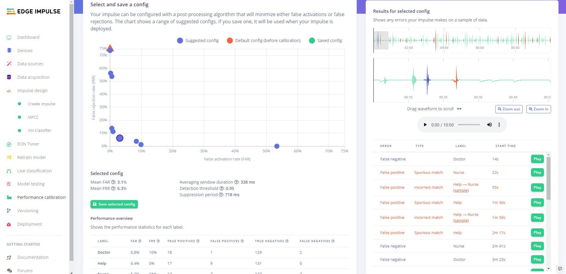 When it comes to healthcare applications, close might not be good enough. So the Performance Calibration tool was used to further test the model by assessing how it will perform under real world use with streaming audio data. The results of this testing helped with the selection of an appropriate post-processing algorithm that fine-tunes the final result. Adjustable parameters can tune the post-processing algorithm to control the trade-off between the false acceptance rate and false rejection rate. In short, the Performance Calibration tool makes a good model perform even better.