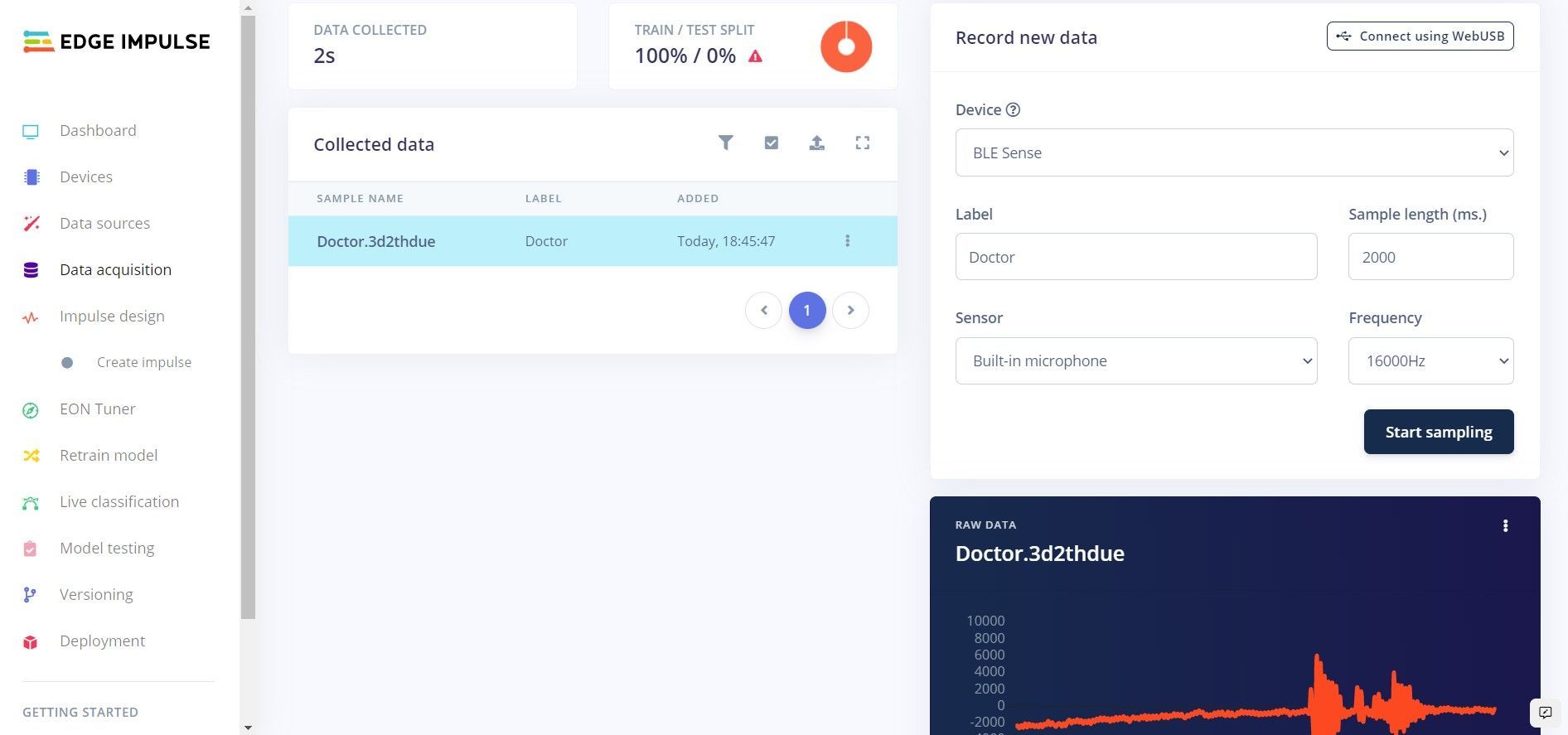 To teach the algorithm to understand the keywords, Milton-Barker recorded a custom dataset. He accomplished this by first linking the Arduino to his Edge Impulse project, which allowed him to record utterances with the onboard microphone and have them automatically uploaded to Edge Impulse. A total of 150 repetitions of each keyword were spoken during the data collection process. To make the model more robust, a “noise” class was also recorded and combined with data from the Microsoft Scalable Noisy Speech Dataset. As a final step, random speech samples were extracted from this same Microsoft speech dataset and used to create an “unknown” class.