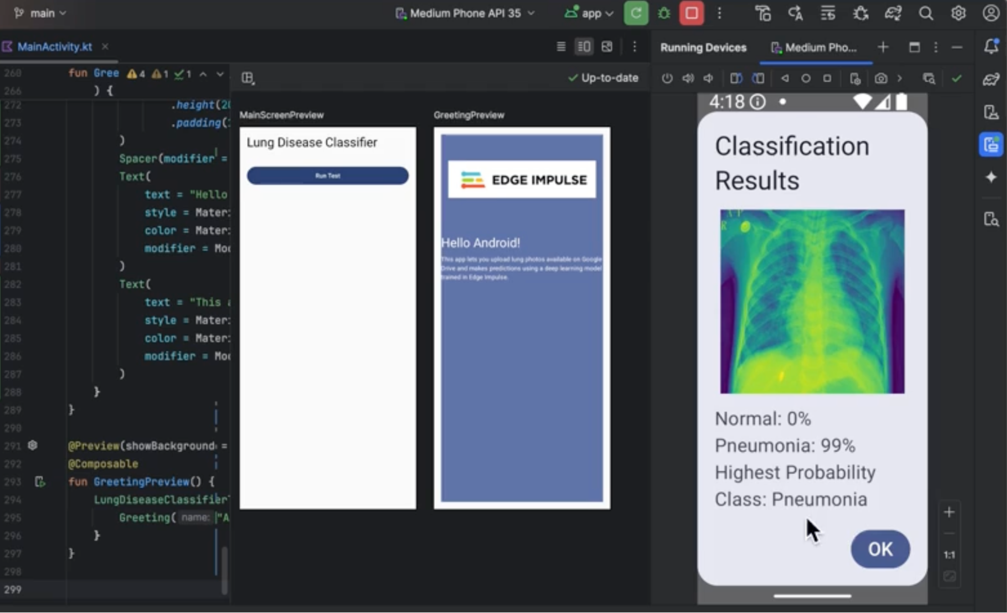 tflite.run(inputImage, result);UI Integration: Design a simple greeting screen or image upload interface where users can upload an X-ray image for classification.