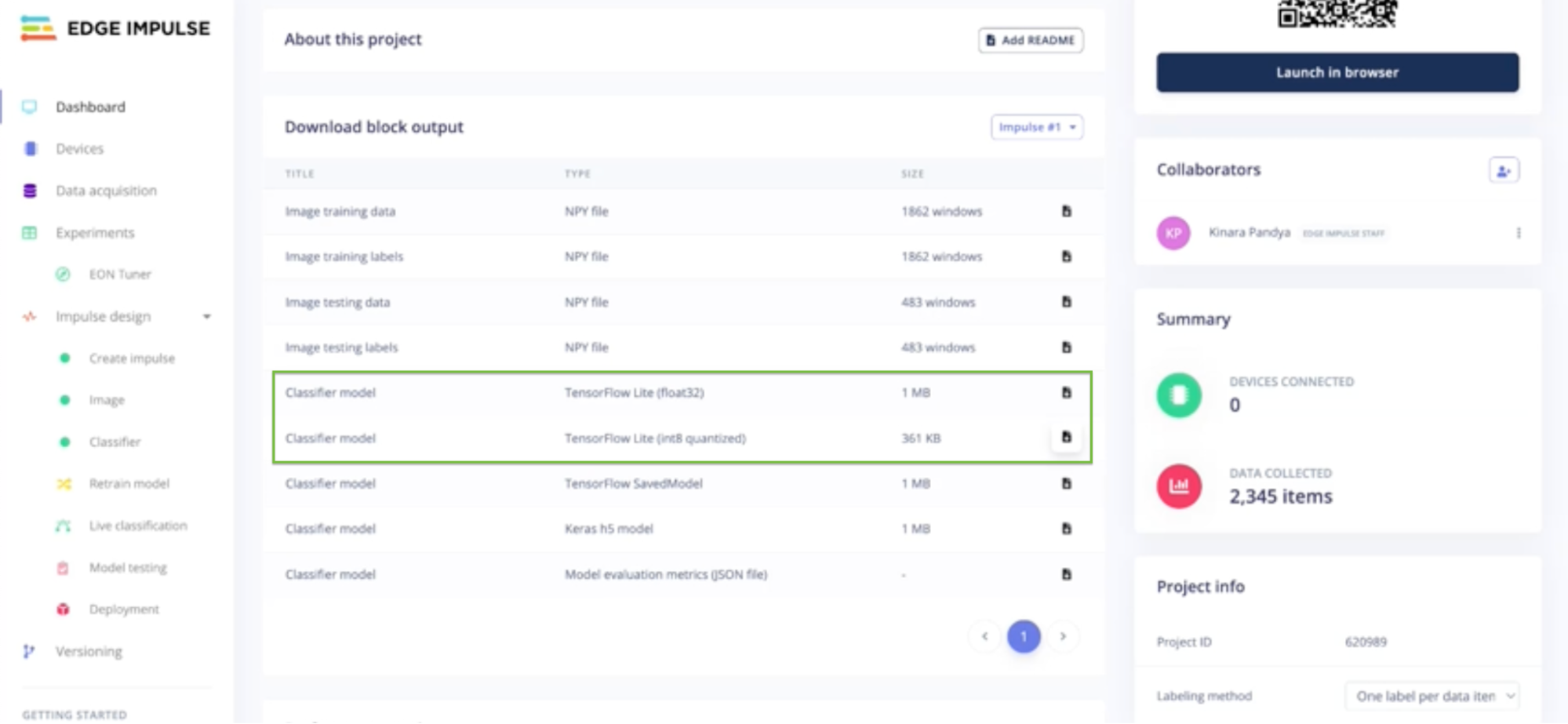 - In Edge Impulse, simply click to export the trained model as a .tflite file