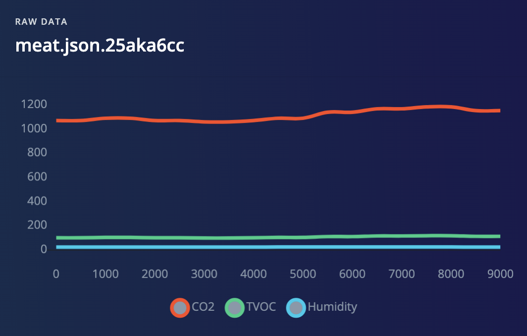 We have collected around three minutes of training data for our different classes: true smoke (generated by a canned smoke detector tester spray), smoke from cooking meat (nuisance smoke) and no smoke (or ambient). New data points are collected every 500ms from the sensors.