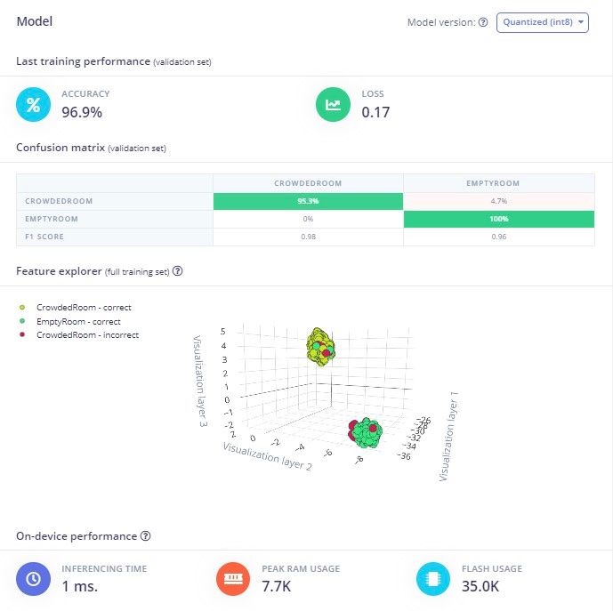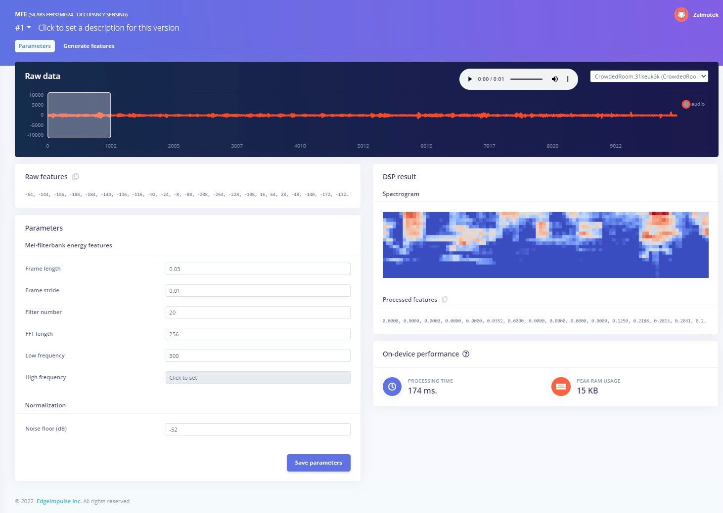 There was not a lot of work involved in getting the hardware set up, so attention was quickly turned to training the neural network. A custom firmware image provided by Edge Impulse was downloaded and flashed to the board, which allowed it to connect directly to Edge Impulse Studio. With that connection in place, data could be collected from onboard sensors and automatically transferred into an Edge Impulse project. Zalmotek collected a very modest three minutes of audio samples for each class (occupied, unoccupied). The data acquisition tool automatically split this data between training and test datasets.