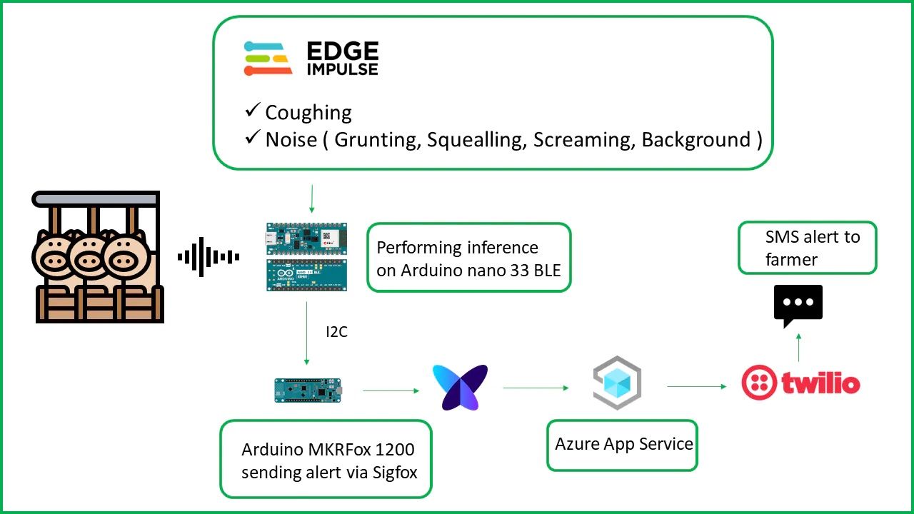 Oduor selected the tiny, but capable, Arduino Nano 33 BLE Sense development board to handle running inferences with the machine learning model, and also to collect audio samples from pigs with the onboard microphone. An Arduino MKR FOX 1200 was also a part of the build to enable low-power wireless notifications to be sent over the wide range of the Sigfox network. The two boards were hooked together via I2C, then placed in a custom plastic casing that can be mounted in a pigsty.