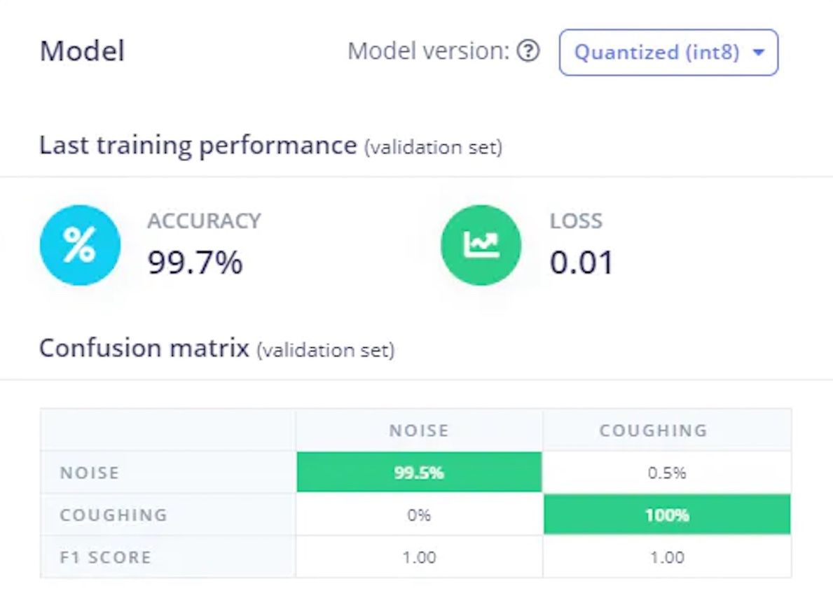 The classifier was trained on the uploaded data after tweaking a few model parameters. Validation of the model showed an excellent classification accuracy of 99.7%. Such a good result meant that the model was ready for deployment to the physical hardware of the cough detection device. The model was downloaded as an Arduino library that had been optimized by the EON Compiler. The EON Compiler is capable of greatly reducing the RAM and ROM usage of the model, such that it fits comfortably on a highly resource-constrained device, without reducing accuracy.